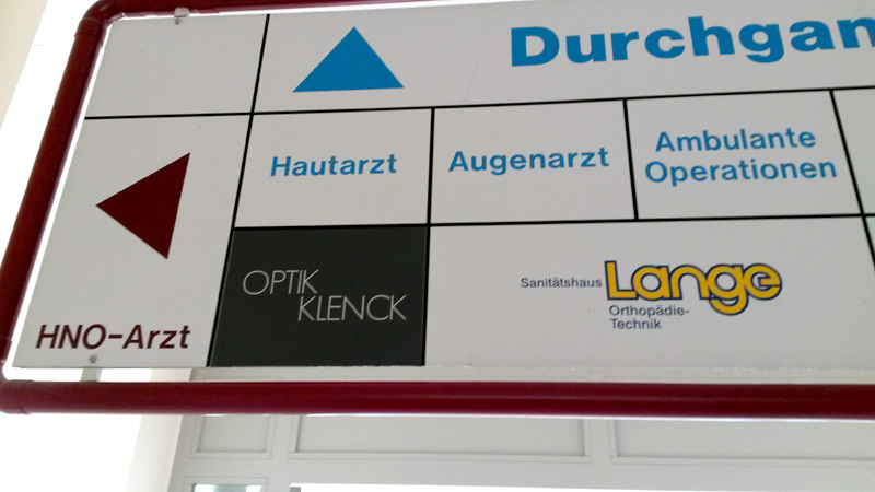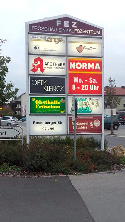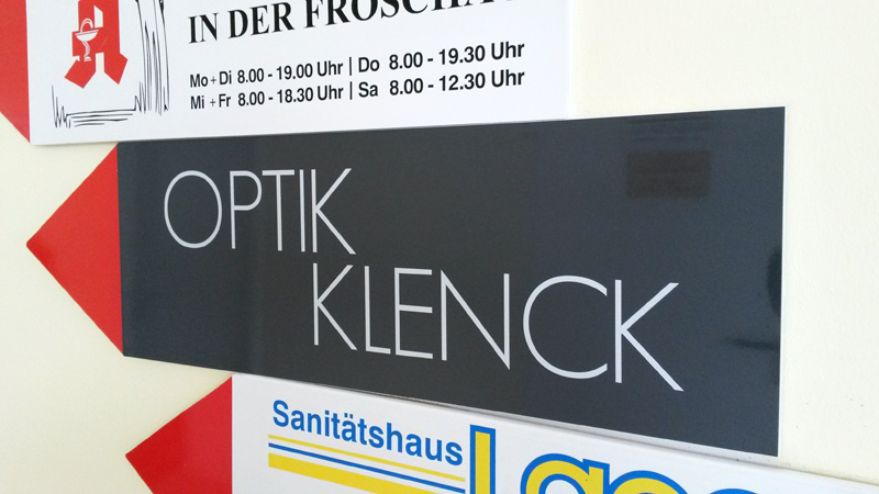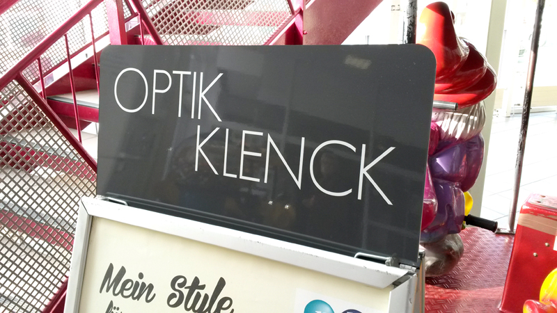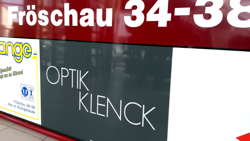 Einen weiteren Großauftrag bekamen wir von der Firma Optik Klenck. Im Fröschauer Einkaufszentrum haben wir die Beschilderung überall im Gebäude durch das neue Firmenlogo ersetzt und auch an den Außenfassaden wurde die Leuchtreklame ausgetauscht.