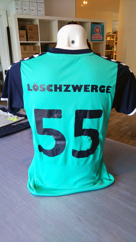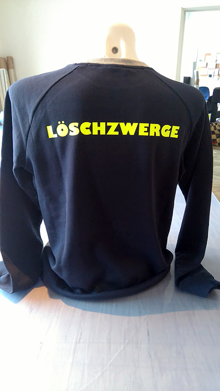 Nadine Hagerer hat uns gebeten für Ihre Hobbymannschaft Die Löschzwerge Trikots und Sweatshirts zu bedrucken. Dafür wählten wir Flexfolie in dunkelblau passend zur Trikotfarbe und neongelb für die Sweatshirts.